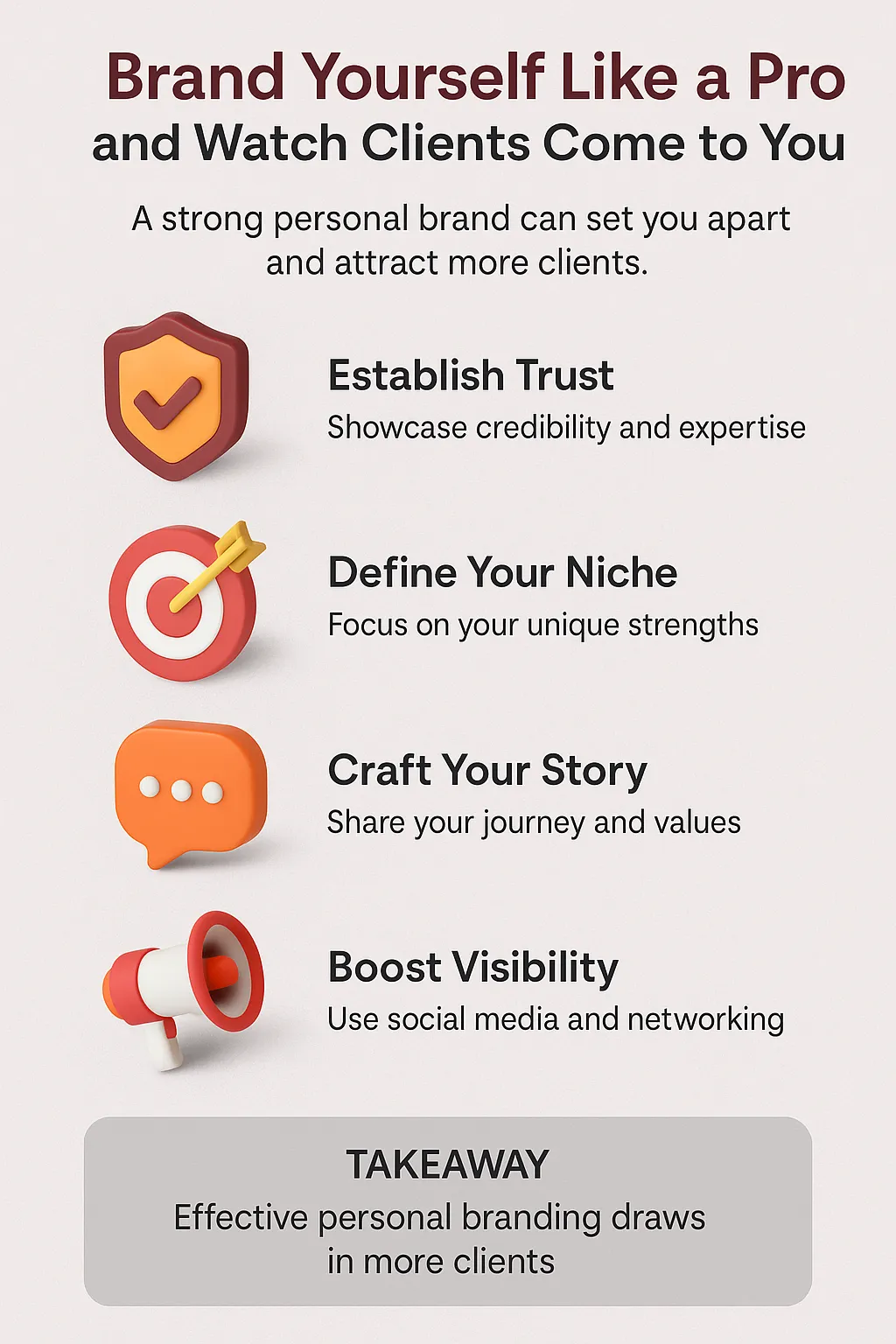 Professionals who invest in their personal brand often find the client dynamic completely shifts. Instead of chasing leads, they attract inquiries. Instead of competing on price, they stand out on value. In short, branding yourself like a pro doesn’t just bring clients in—it ensures they’re the right clients.
