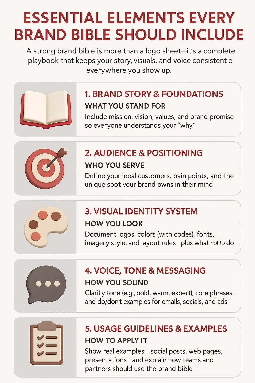 Unlike generic templates found online, this guide reveals the essential elements every brand bible should include, drawn from real-world experience helping startups and established companies build lasting brand identities. Readers will learn what to include in a brand bible document and how leading brands maintain visual harmony, tone consistency, and audience trust through structure and strategy.