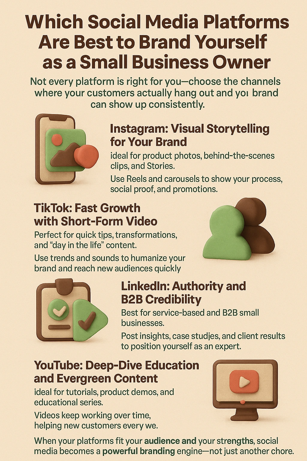 Branding yourself as a small business owner isn’t just about visibility — it’s about believability. Each social platform gives you a different way to share who you are, why you do what you do, and how your business reflects your personal story. The goal is to focus where your voice carries the most weight.
